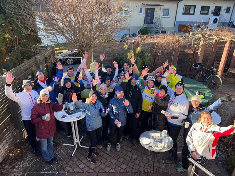 Nicht lange nach Ankunft der Walker surrten auch schon die Ketten der Radgruppe vor Beckers Anwesen. Auch ihrer Stimmung konnte der Frost nichts anhaben, denn ihr Gruppenleiter Bernhard Becker suchte einen Streckenverlauf mit maximal möglicher Sonneneinstrahlung heraus, wodurch die Gruppe zumeist auf trockenem und griffigem Asphalt unterwegs war. Bergige Streckenabschnitte konnten hierdurch zwar nicht eingebaut werden, da diese zu schattig und damit häufig auch etwas eisig waren. Aber diese vermisste auch keiner. Denn „Safety First“ war das Motto von Bernhard, alle sollten heil die Tour beenden. Damit genossen alle Radsportler den ungetrübten Spaß, egal ob jung oder alt, ob Gruppenfahrer 1 oder 4.