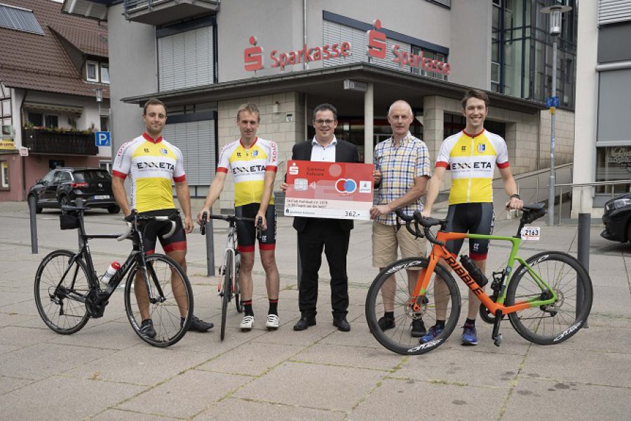 Anlässlich der sportlichen Spendenaktion des SkiClub Karlsbad „in 80 Tagen um die Welt“ überreichte 3. v.l. Herr Thomas Anzböck Filialleiter der Sparkasse Karlsruhe u.a. einen Scheck in Höhe von 362,- EUR an die Vertretung des SCK Rennrad-Teams. Der Er…