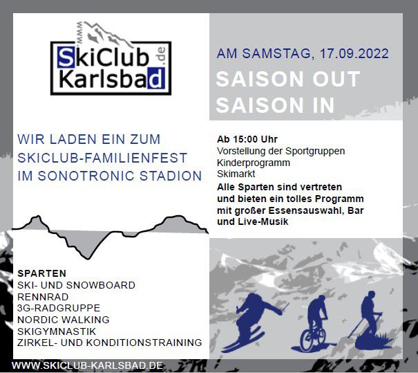 Am 17. September 2022 veranstaltet der Skiclub Karlsbad ein großes Familienfest für alle im SONOTRONIC-Stadion (Jahnstraße 65, 76307 Karlsbad) - unter der Tribüne - mit Vorstellung unserer einzelnen Sparten, Kinderprogramm mit Rallye und Hüpfburg, Skimarkt(!), Kaffee und Kuchen und einer großen Essensauswahl. Gegen Abend dürft Ihr euch über einen Barbetrieb und Livemusik freuen.